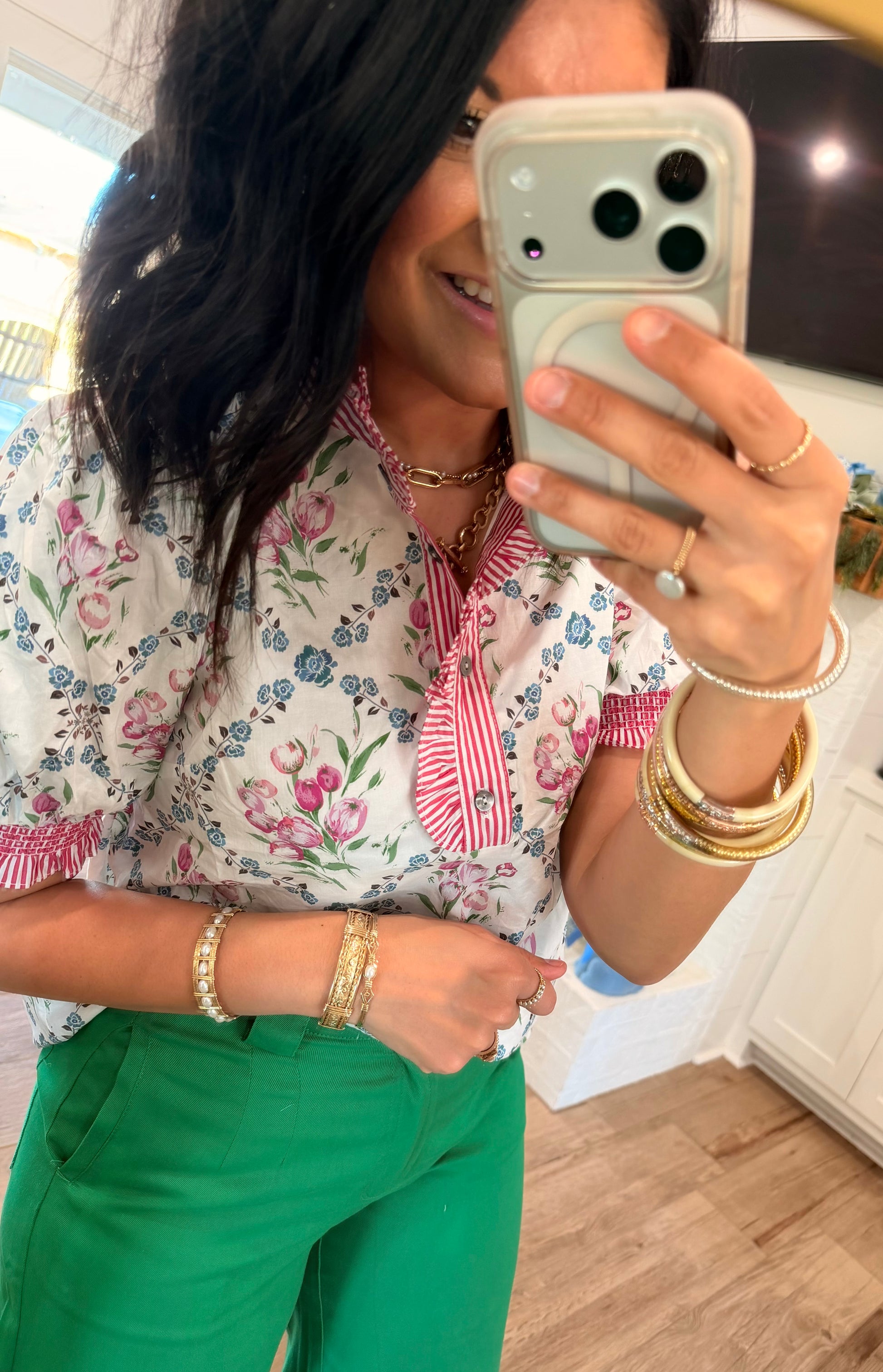 Soft, romantic, and effortlessly polished, this cream floral top is designed to bring a fresh touch to your wardrobe. Featuring a delicate pink and blue floral print, it’s beautifully complemented by a contrast stripe band collar and partial button front for a hint of classic structure. Puff short sleeves with contrast smocked cuffs add subtle volume while enhancing its feminine charm.