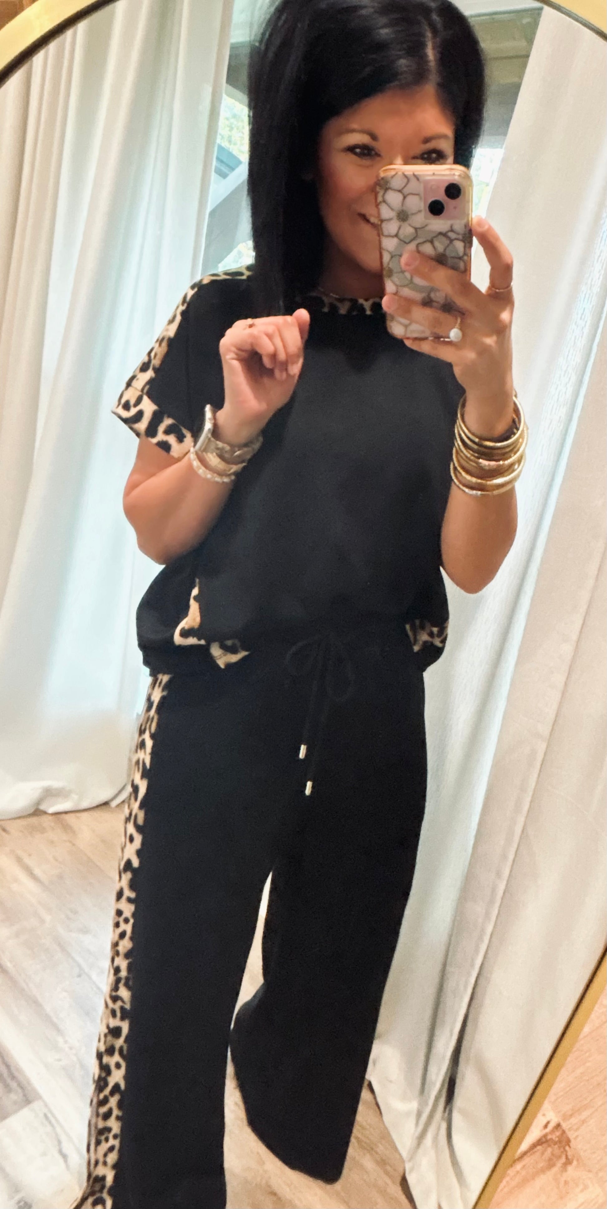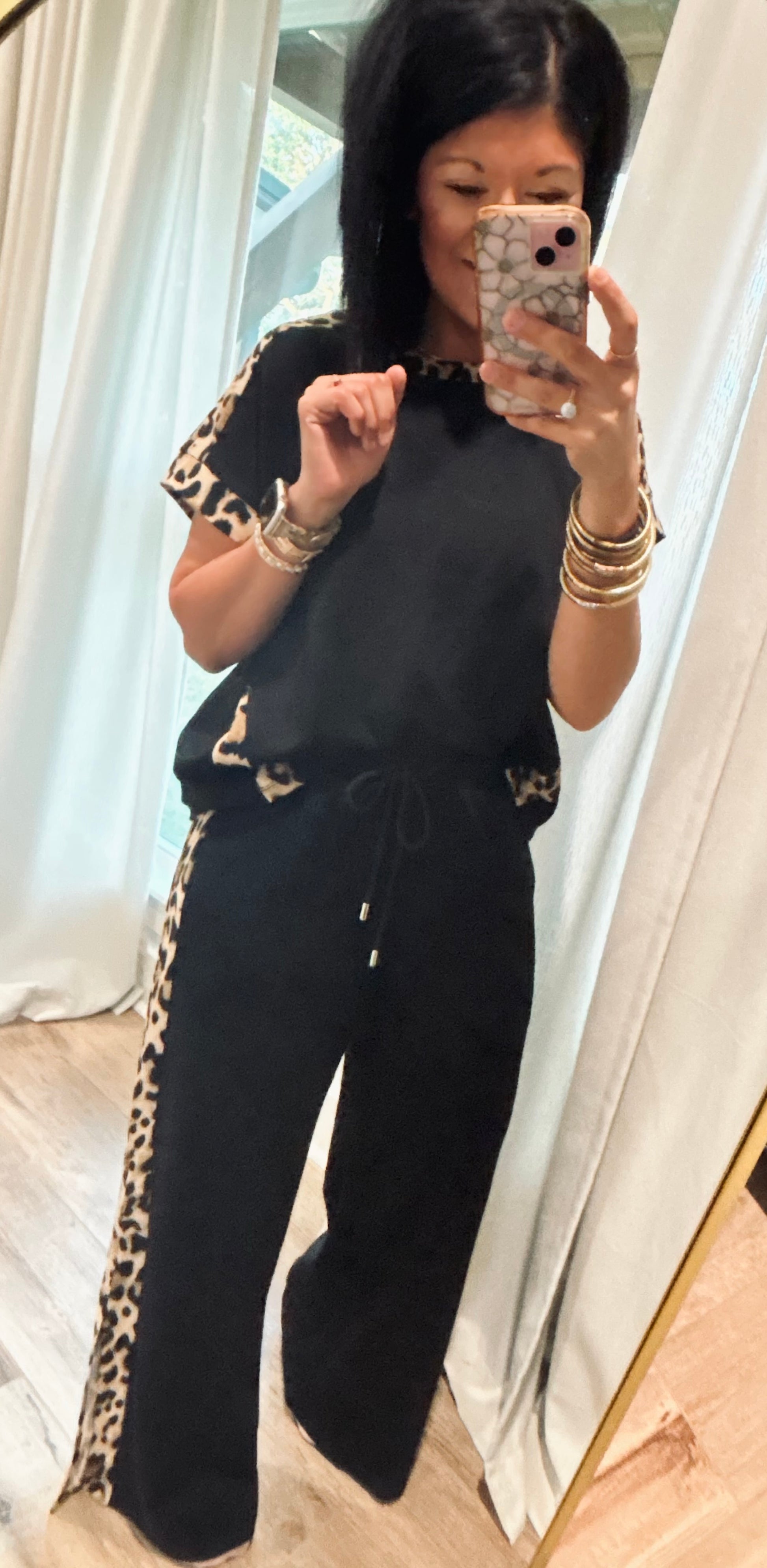 Turn heads in this sleek and stylish two-piece scuba set! The short-sleeve top and matching wide-leg pants are designed for both comfort and confidence. The pants feature a trendy side split at the hem for effortless movement, while a bold leopard stripe runs down the side of each leg, adding a fierce touch of flair. Coordinating ribbon detailing on the sleeves and along the sides of the top tie the look together perfectly.