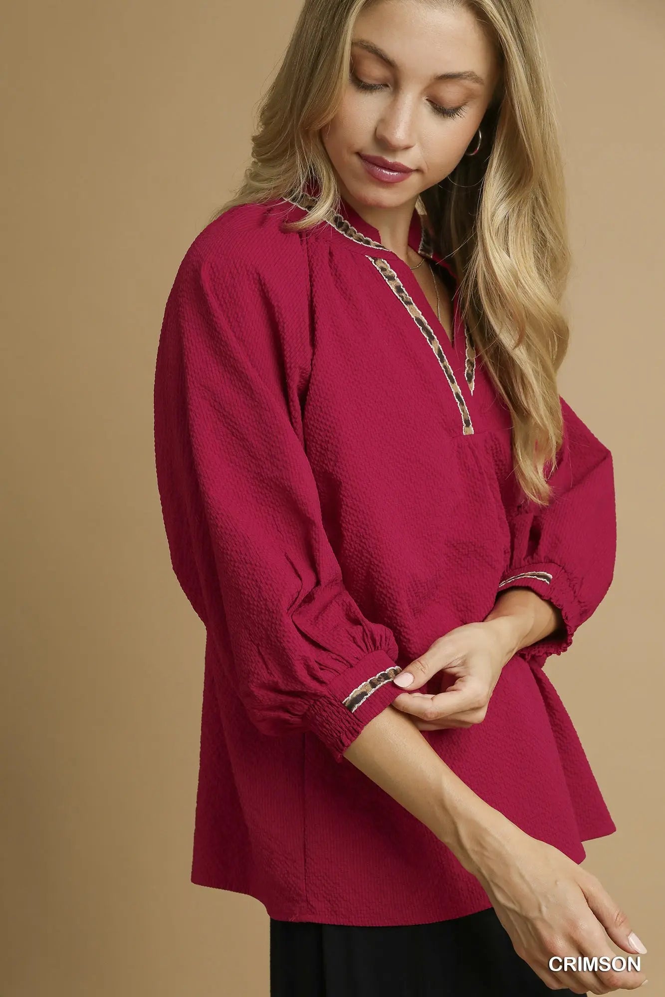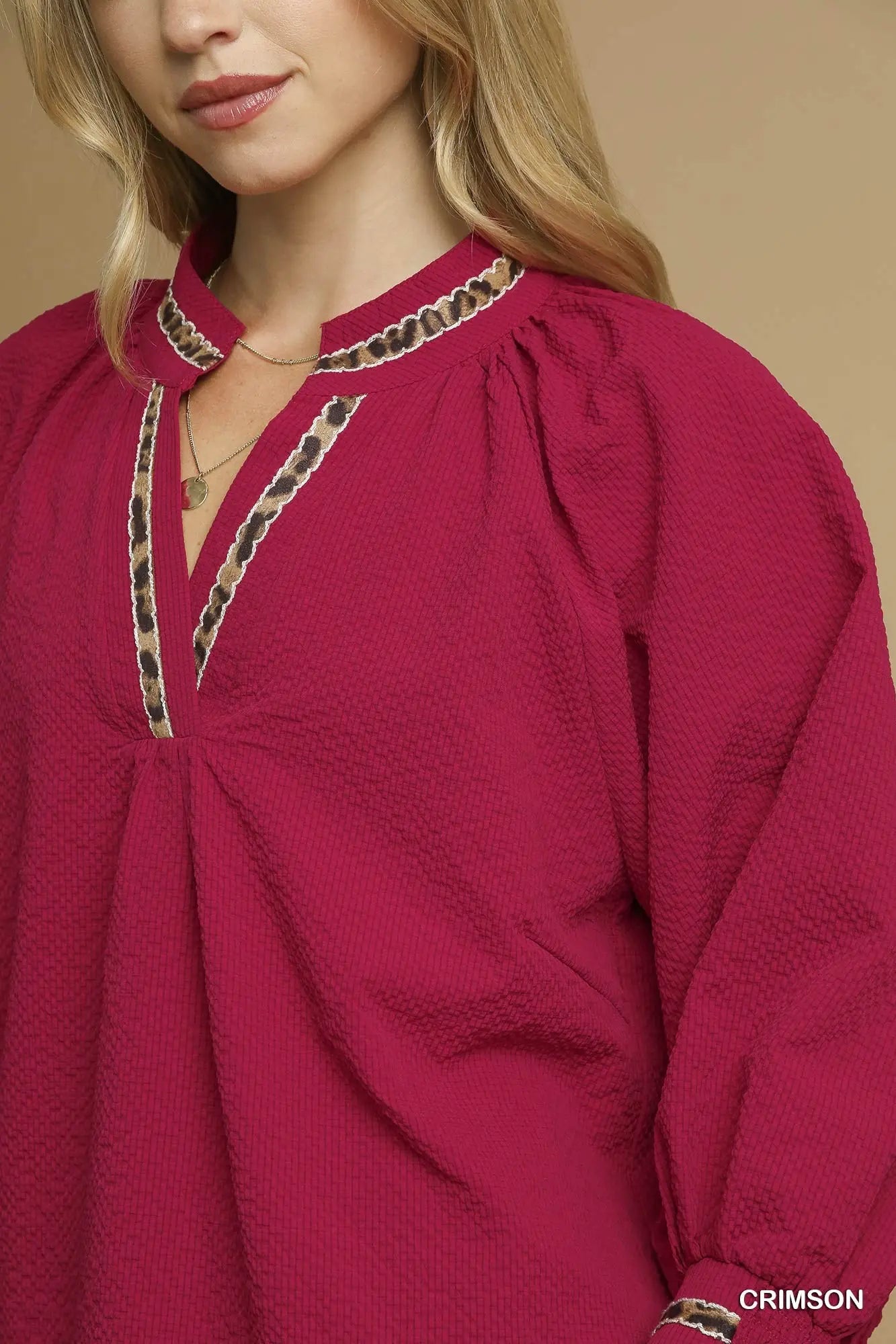 Make a bold statement in the Crimson Puff Sleeves V Neck Collared Top. This vibrant piece combines a classic V-neck and puff sleeves with an eye-catching animal print trim, adding a modern twist to your wardrobe. The front portion is lined to ensure comfort and confidence all day long. Made from 100% polyester, it’s lightweight, soft, and effortless to style.