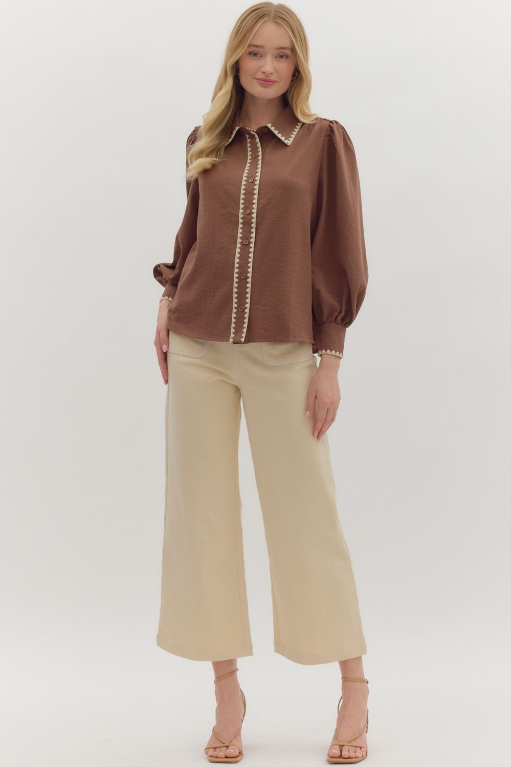 A timeless wardrobe staple with a modern twist. This long sleeve button-down top comes in a rich espresso brown hue, featuring a cream blanket-stitch accent along the collar and button closure for a subtle yet stylish contrast. Crafted from a soft and durable blend of 49% rayon, 34% polyester, and 17% nylon, it offers both comfort and structure. Perfect for layering or wearing on its own, this piece transitions effortlessly from work to weekend.