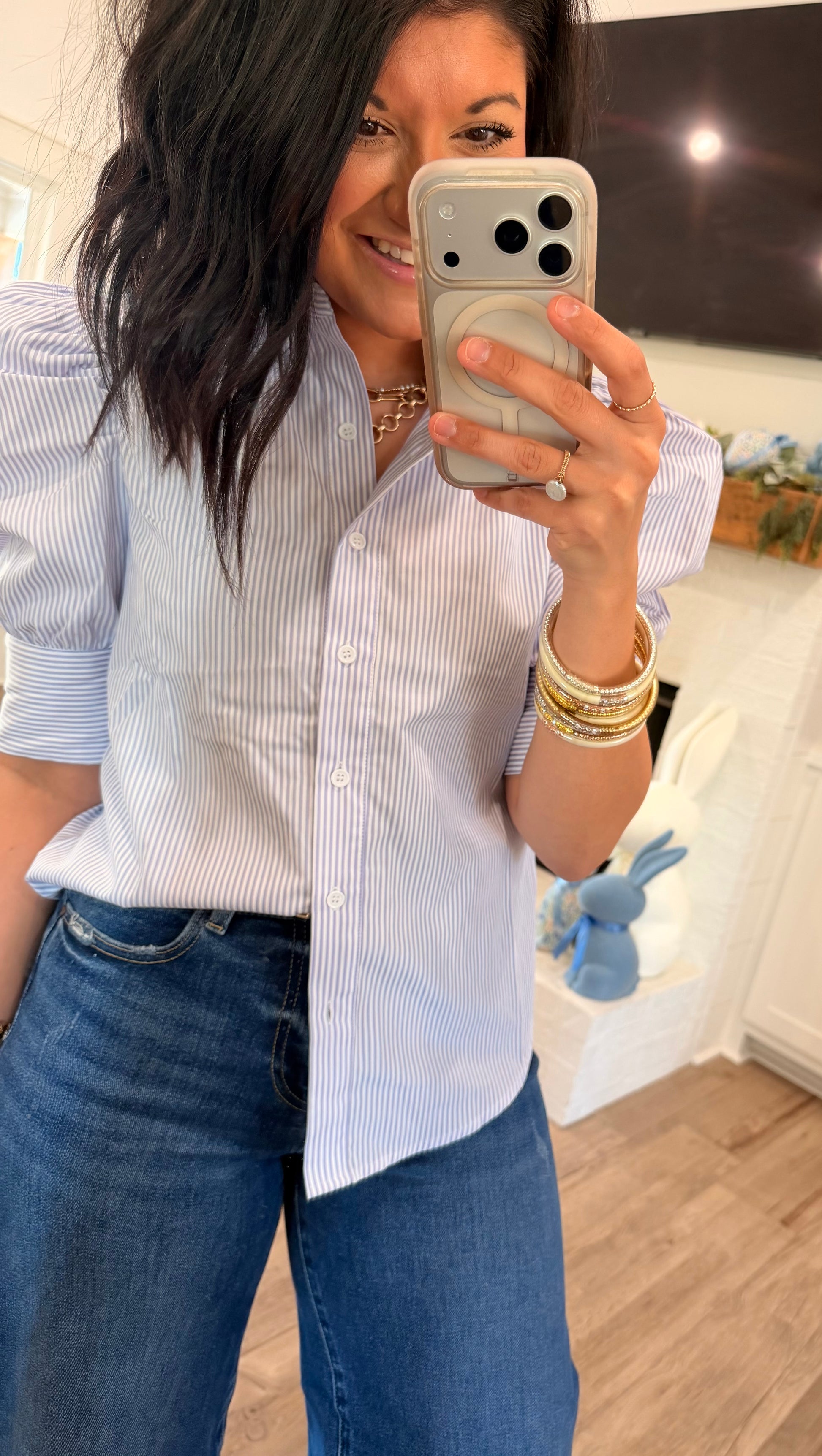 Chic meets everyday comfort in this must-have lavender striped top. The collared neckline and button-front design keep the look classic, while puff sleeves add a stylish, on-trend touch. Lightweight and easy to style, it’s the kind of piece that instantly makes you look polished with minimal effort.