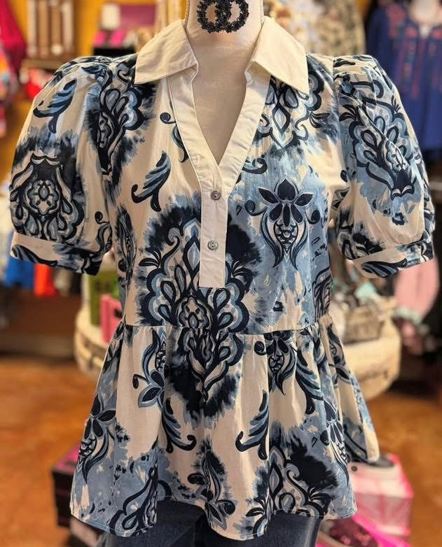 A timeless blend of sophistication and comfort, this 100% cotton navy blue top features a crisp white V-neck collar with a delicate white ribbon detail running down the front. The contrast design adds a touch of elegance, making it perfect for both casual styling and polished occasions. Lightweight and breathable, it’s a versatile piece you’ll reach for again and again.