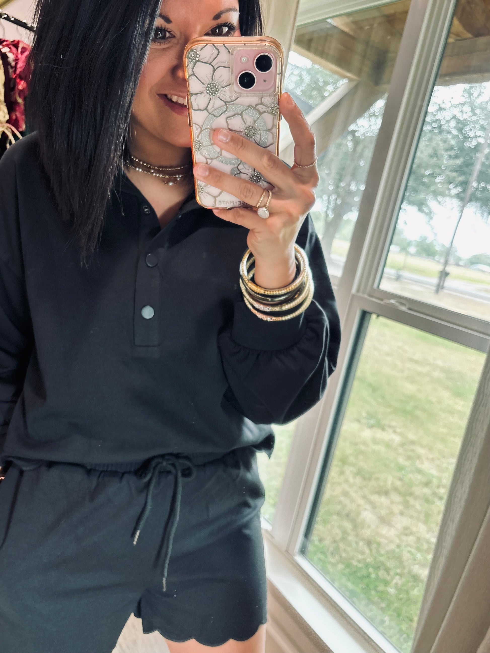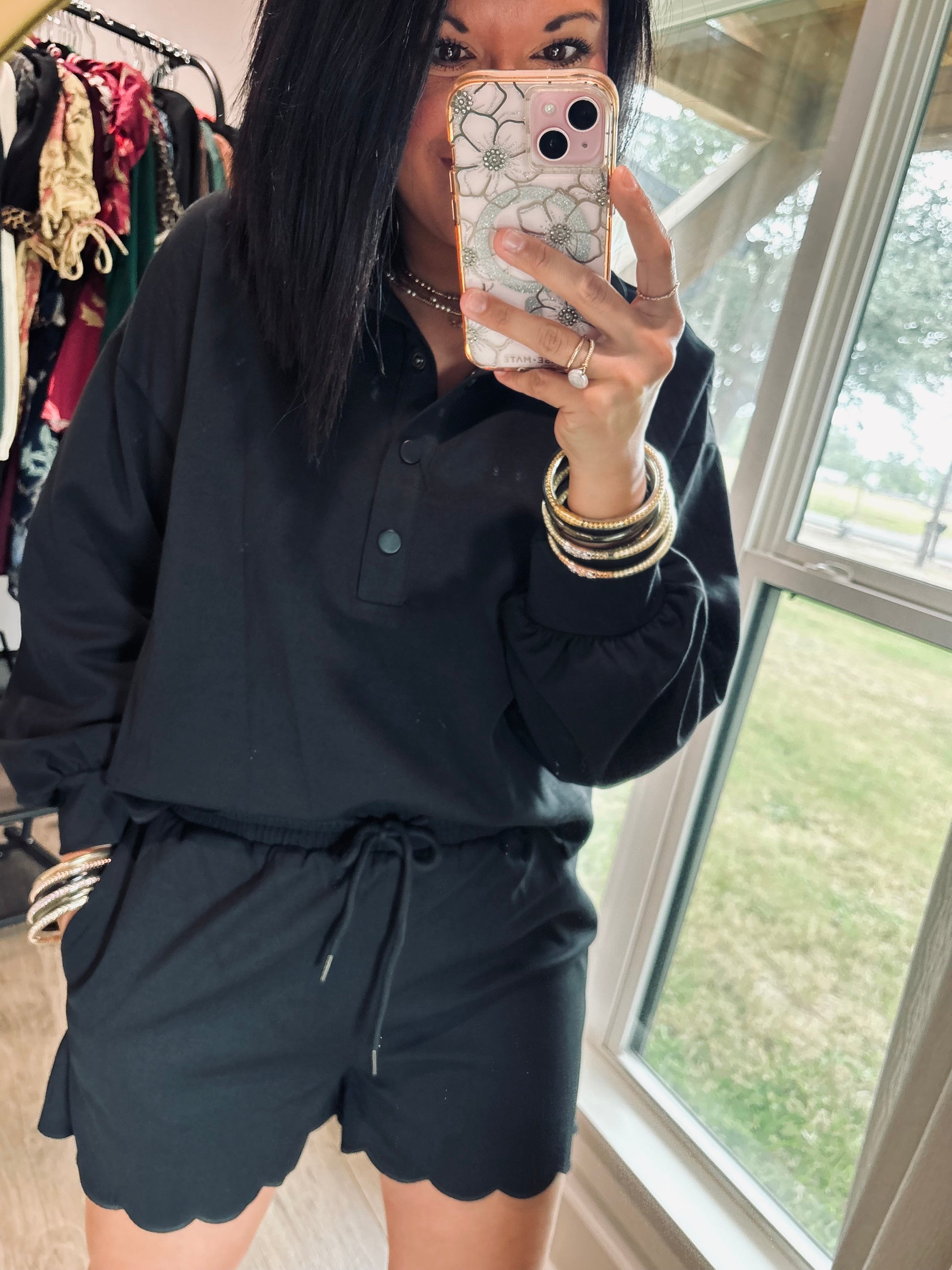 Effortless chic meets everyday comfort in this Black two-piece set. The solid long sleeve pullover top showcases a snap button closure and embroidered scallop edge for subtle elegance. Complemented by high-waist pull-on shorts with an adjustable drawstring elasticated waistband, the set offers a flawless match of style and practicality. Made from a soft, stretchy blend of 50% cotton, 43% polyester, and 7% spandex, it ensures all-day comfort while keeping your look put-together.