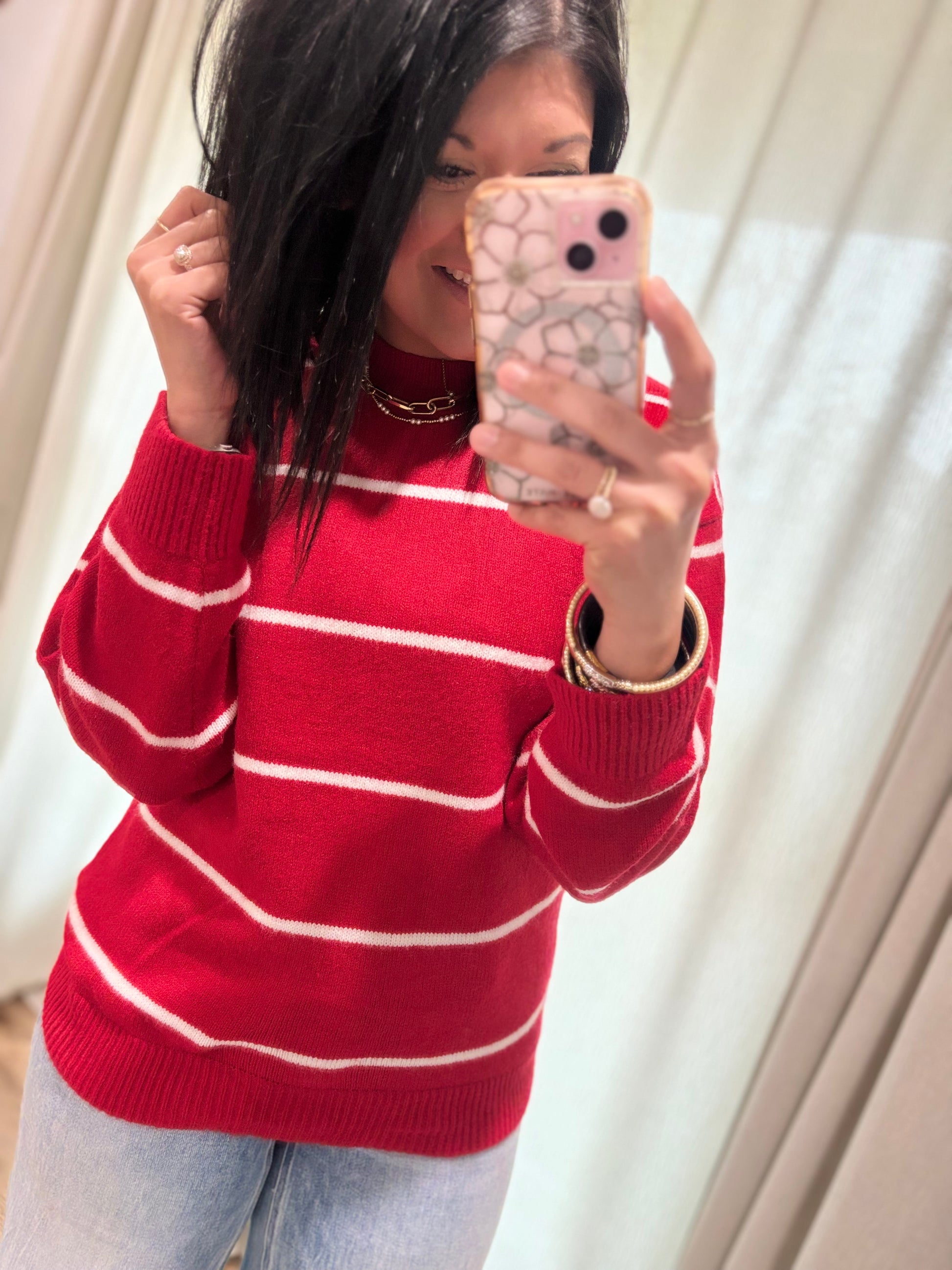 Bold and timeless, this red and white striped sweater brings a classic touch to any wardrobe. Designed with a round neckline, long sleeves, and a slightly oversized fit, it offers both comfort and effortless style. The soft knit fabric drapes naturally, giving you a relaxed yet polished look. Perfect for pairing with denim or layering over your favorite basics, this sweater is a must-have for those who love a vibrant, iconic color combination.