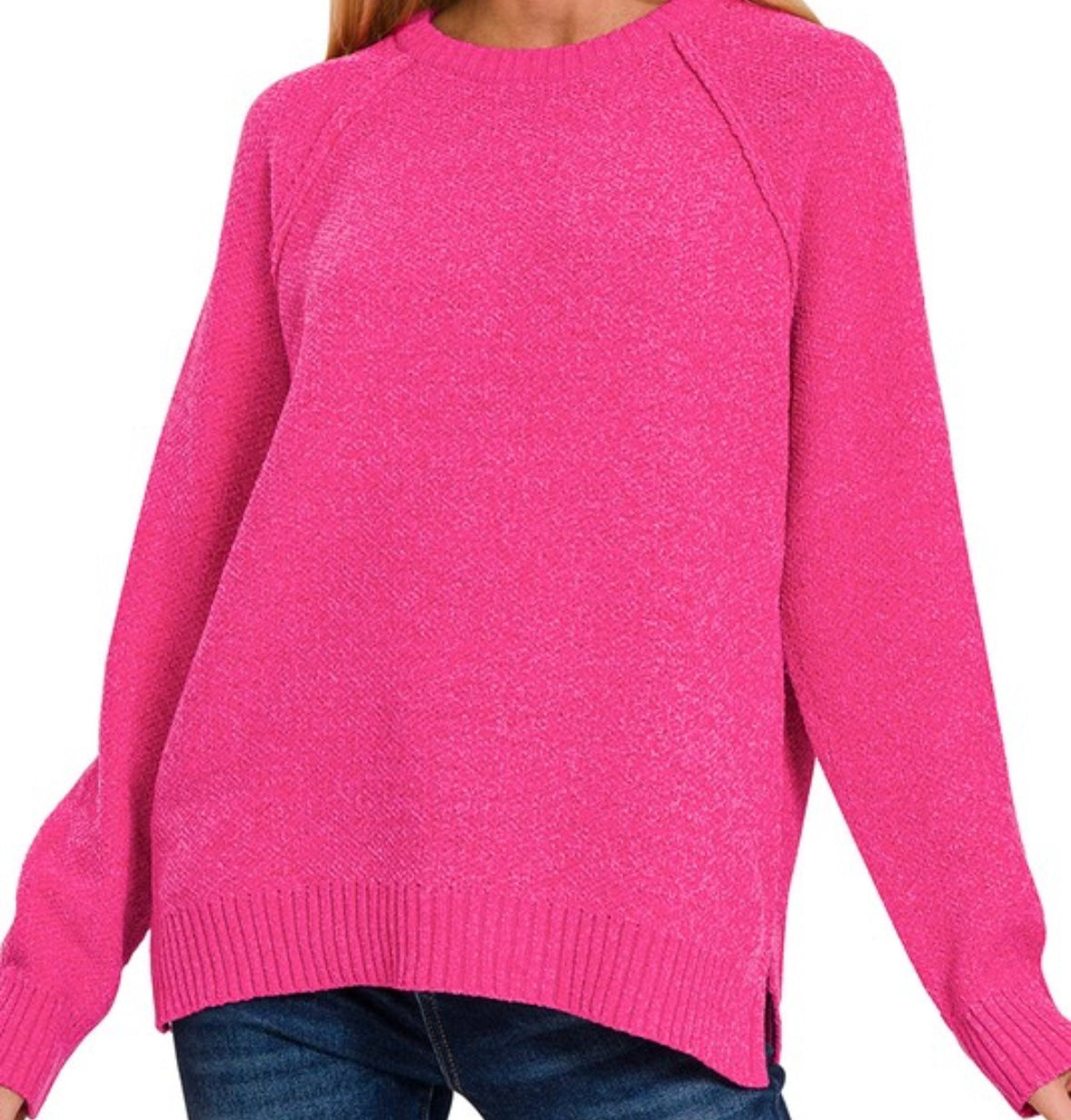 Wrap yourself in pure comfort with this hot pink chenille sweater, designed for those who love softness with a pop of bold color. Featuring a classic round neckline and long sleeves, this sweater offers a slightly oversized fit that drapes beautifully for an effortless, cozy look. The chenille knit gives it a plush, velvety feel while showcasing amazing quality you can see and feel. Perfect for pairing with denim, leggings, or layered accessories—this statement piece brings warmth, comfort, and standout style to any outfit.