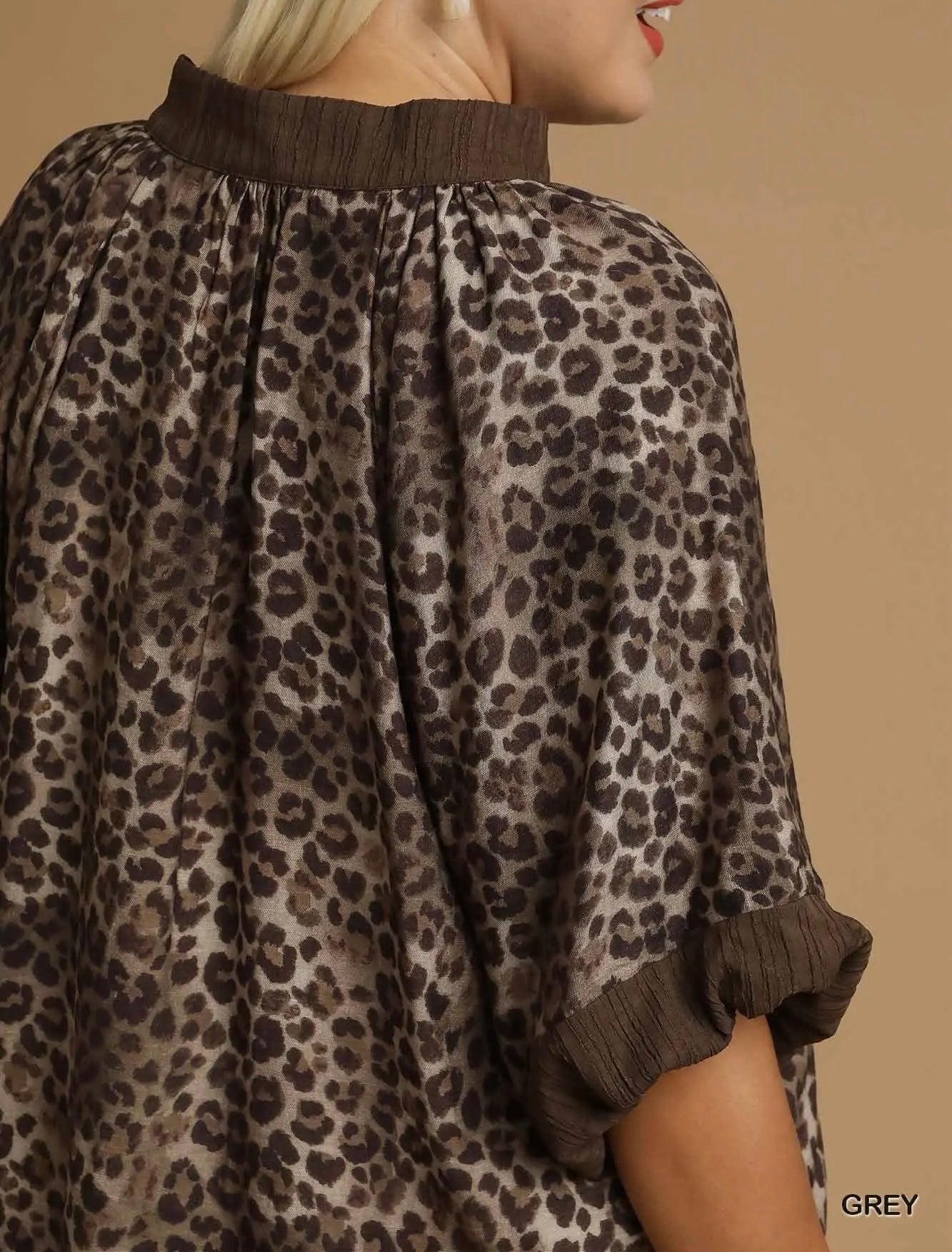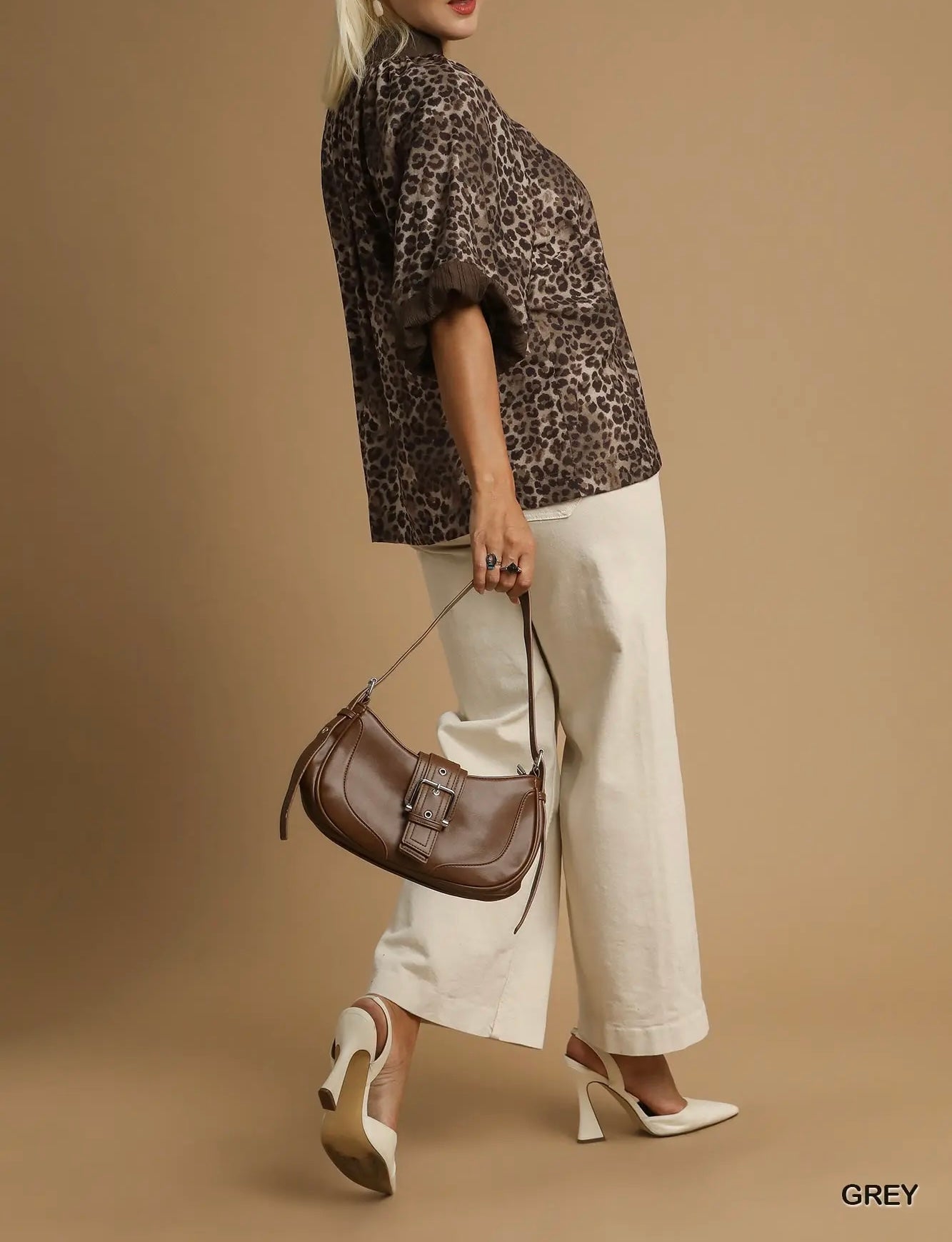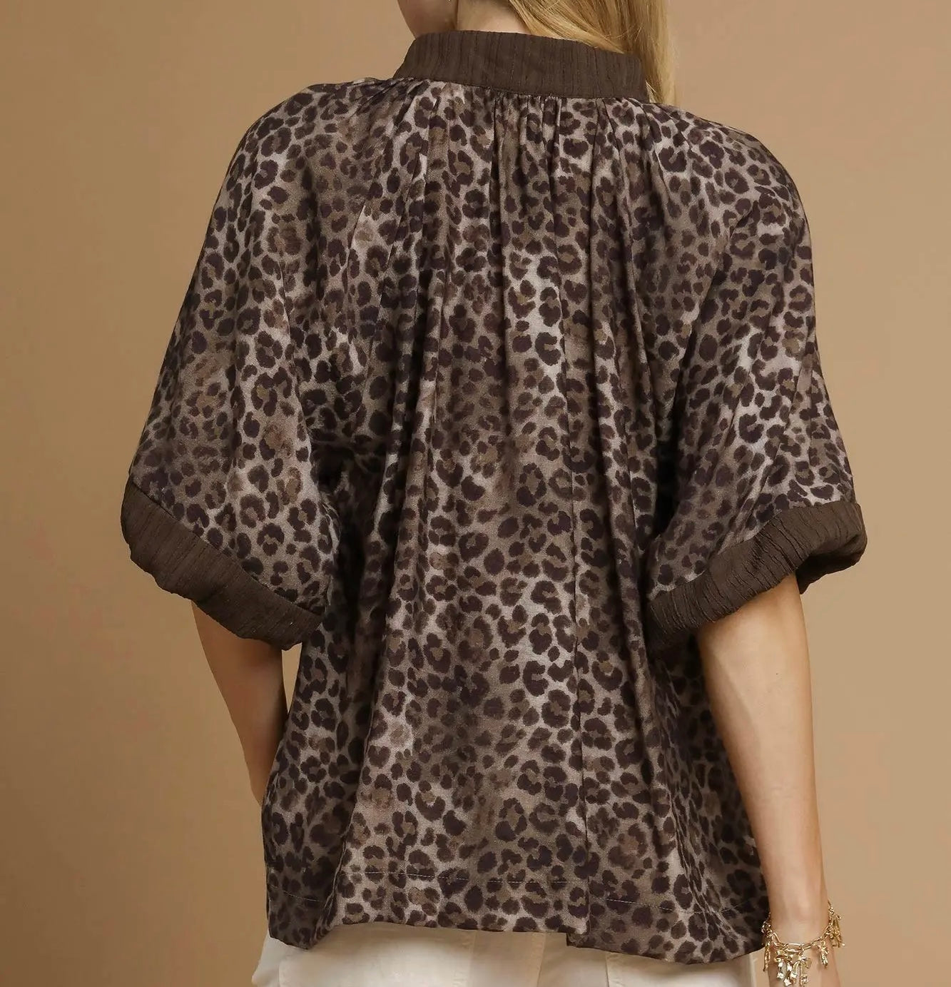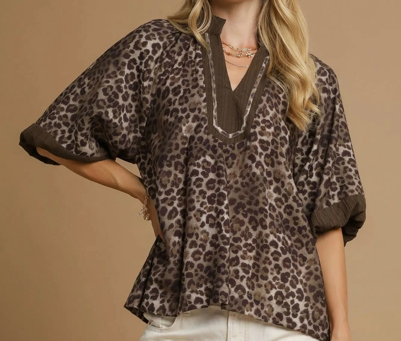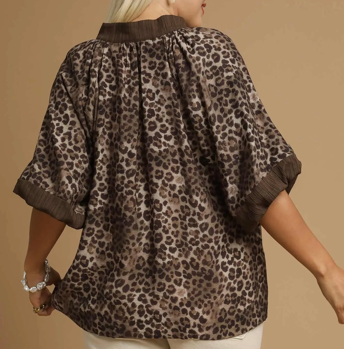 Fierce meets feminine in this leopard print pleated top, designed to bring effortless style to any look. The V neckline and loose, flowy silhouette keep it easy and flattering, while the wide short sleeves add a modern touch. Finished with a chic contrast ribbon detail at the collar, neckline, and sleeve edges, it’s a bold yet versatile piece that transitions seamlessly from day to night.