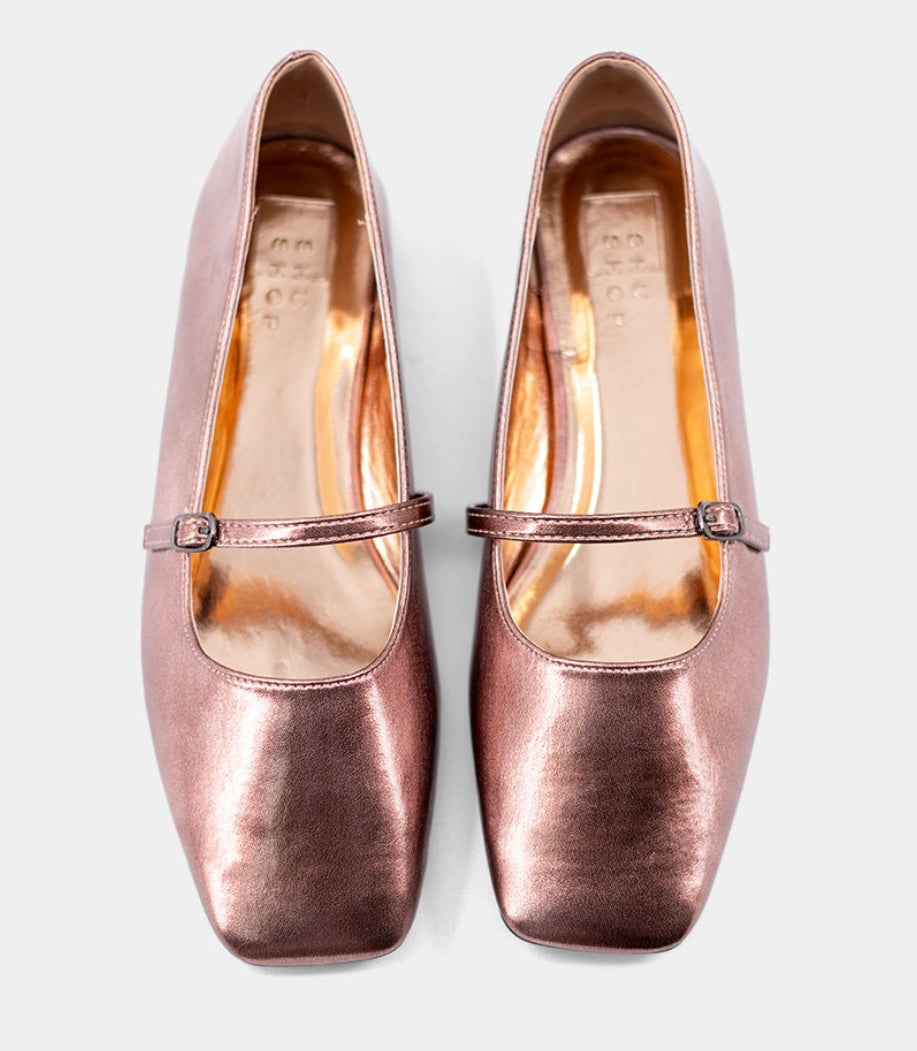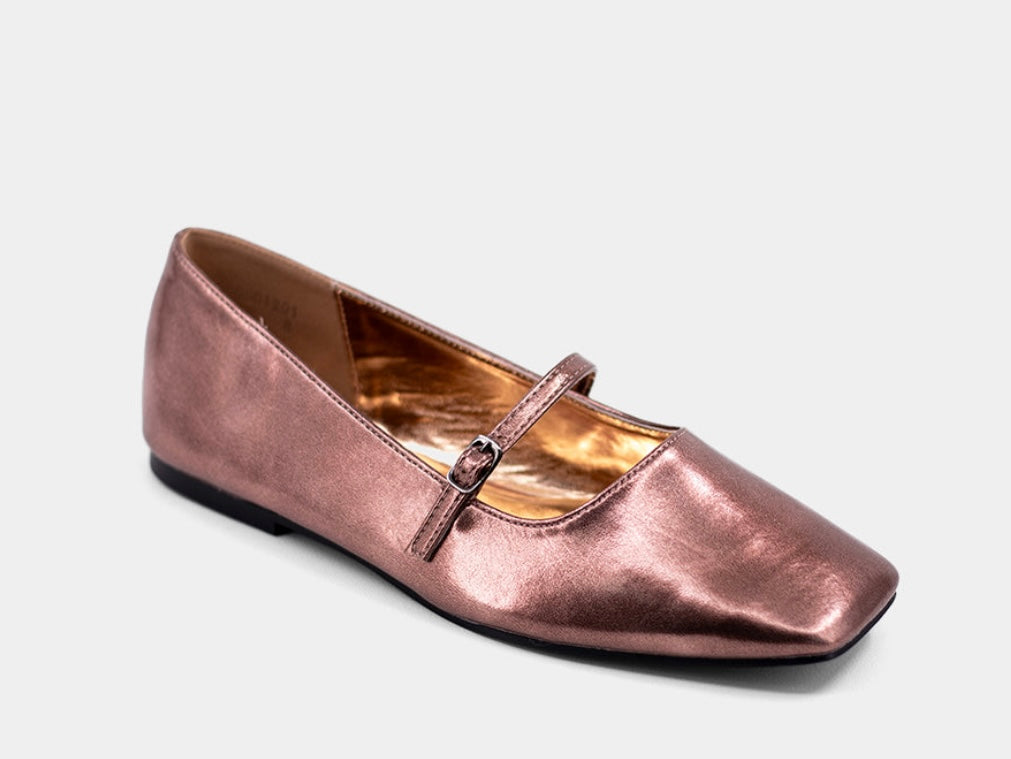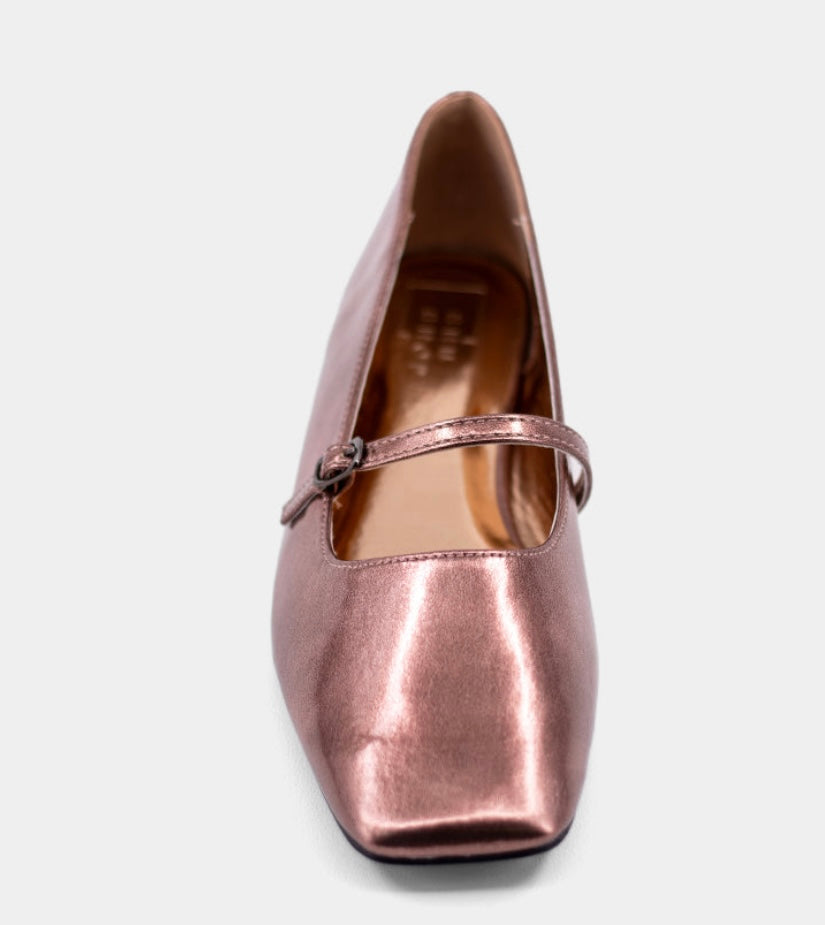Step into effortless elegance with the ADELE flat in stunning rose metallic faux leather. Featuring a pointed-toe silhouette and a chic buckle strap, these Mary Jane flats combine sophistication with modern style. The cushioned insole ensures all-day comfort, making them perfect for everything from casual outings to upscale events.
