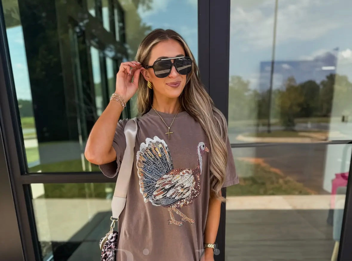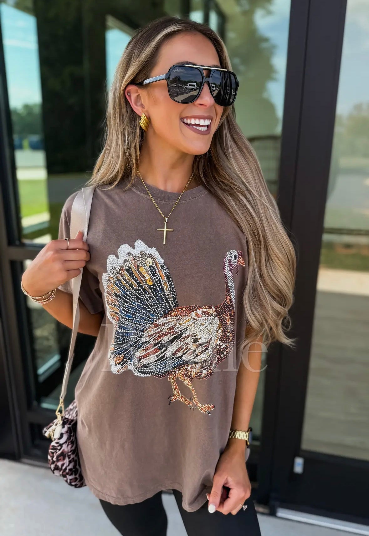 Get festive in style this Thanksgiving with our Faux Rhinestone Turkey Tee! Made from ultra-soft Comfort Colors fabric in a rich espresso brown, this long-sleeve tee features a sparkling rhinestone turkey design that adds just the right amount of holiday flair. Perfect for Turkey Day gatherings, casual outings, or cozy fall lounging, it’s a fun and comfortable way to celebrate the season.