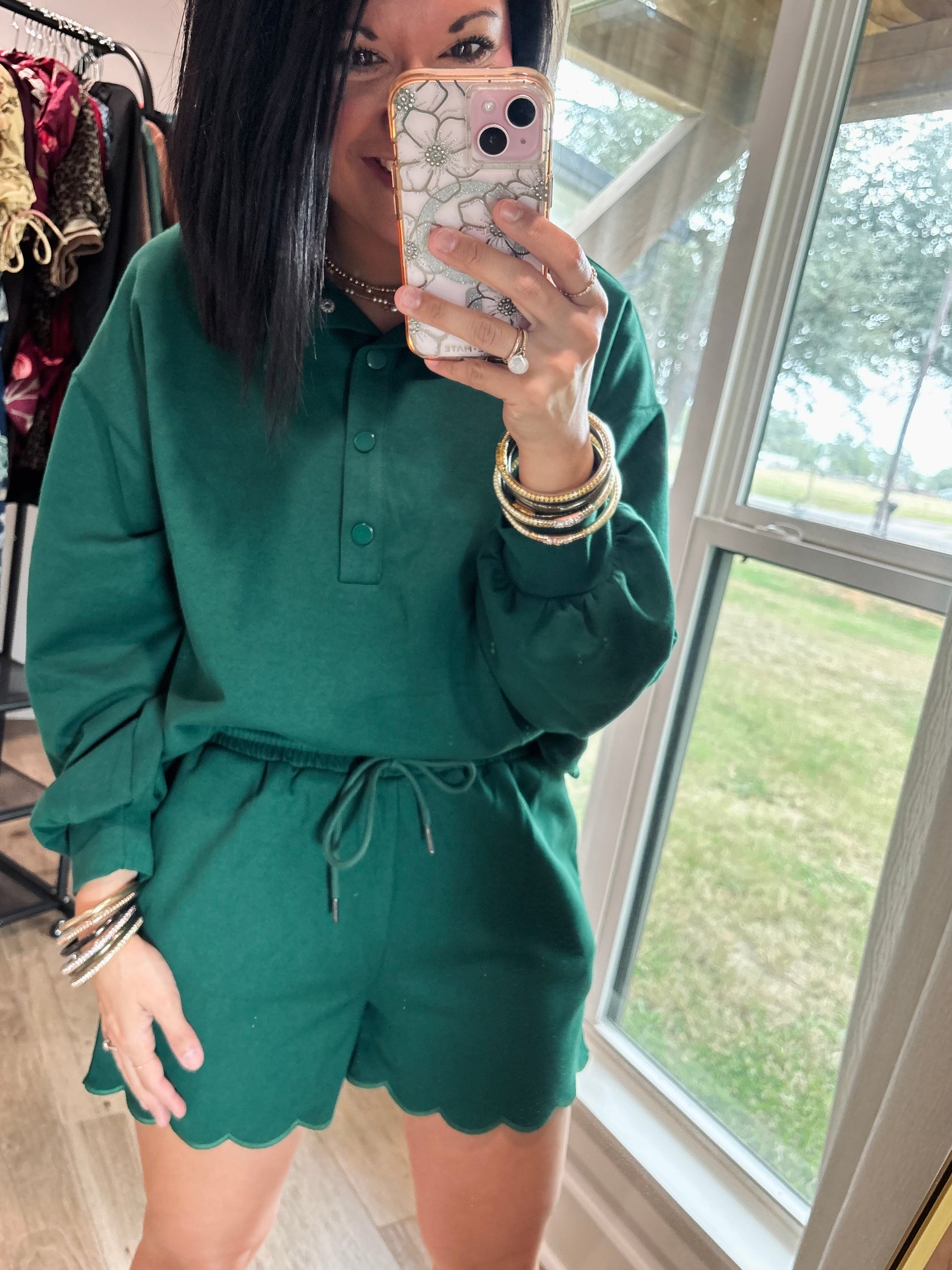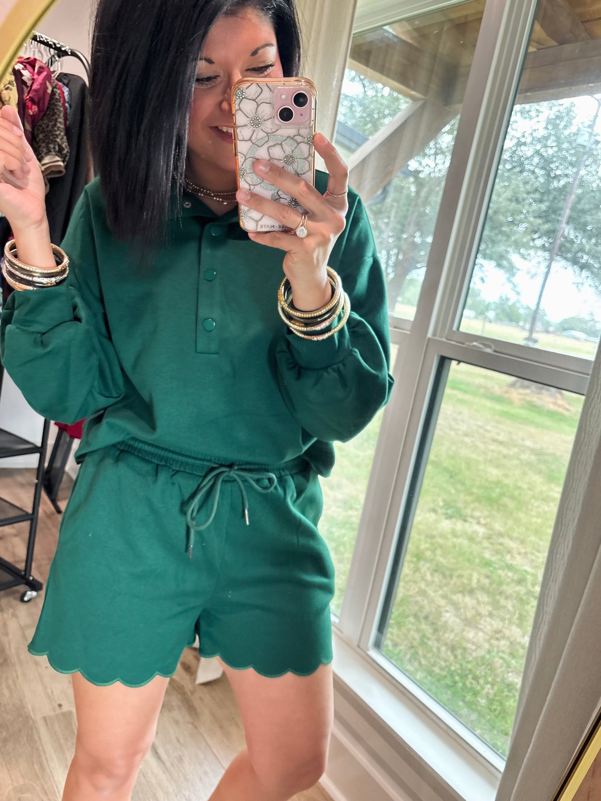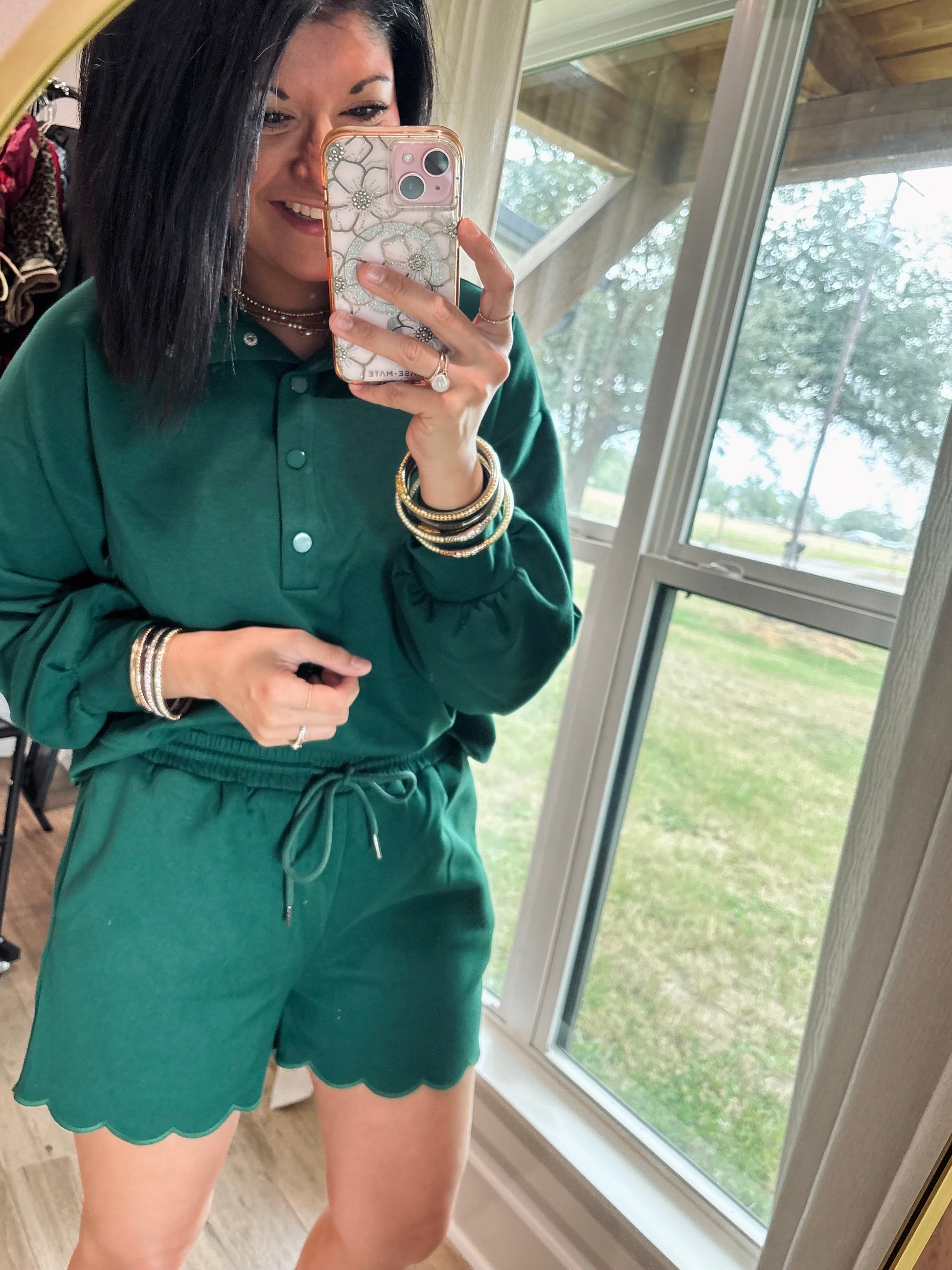 Elevate your casual wardrobe with this Hunter Green two-piece set. The solid long sleeve pullover top features a snap button closure and delicate embroidered scallop edge detailing for a feminine touch. Paired with high-waist pull-on shorts, the set combines comfort and style with an adjustable drawstring elasticated waistband and matching scallop embroidery. Crafted from a soft, stretchy blend of 50% cotton, 43% polyester, and 7% spandex, this set moves with you while keeping a polished, coordinated look.